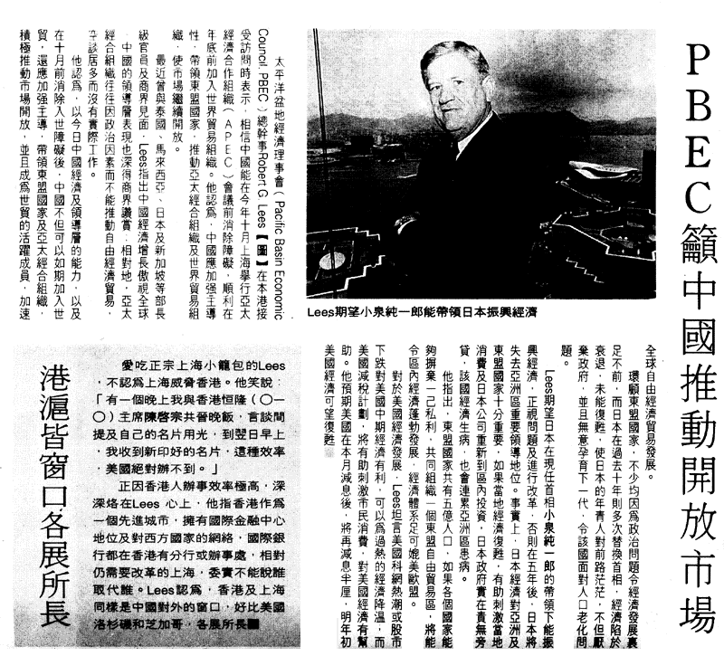 PBEC urges China to promote market liberalization Hong Kong Economic Journal Tuesday, June 20, 2001 Robert Lees, the Secretary General of Pacific Basin Economic Council, said he believed that China will overcome all obstacles and enter the WTO before the end of this year. He thought that China should take the initiative, leading ASEAN countries to push APEC and the WTO for a more liberalized and open market. Mr. Lees recently met with senior officials and business leaders from Japan, Malaysia, Singapore and Thailand. He said in the past decade, China had achieved impressive economic growth, and its leadership receives good marks for their performance. On the contrary, APEC could not push forward economic and trade liberalization for political reasons. Mr. Lees said that with its current economic strength and the capabilities of its leadership, China will overcome the obstacles in front of its accession to WTO and complete the process before the end of this year. What’s more, he thought China should take a lead in APEC to promote market liberalization and become an active member of the WTO. Several ASEAN economies are now stagnant because of their political problems; for Japan, its economy has remained in recession in the past decade, making members of Japan next generation feel frustrated with their future. Mr. Lees hoped that under its new leadership, Japan would carry out reform and return to the track of economic growth, otherwise, it will lose its leading position in Asia. The Japanese economy is very important for Asian countries, its growth will improve the economy of whole region, and Japanese corporations will also be able to increase their investments in this region. The Japanese government should take its responsibility to revive the country’s economy. Mr. Lees said that there is a huge population of 500 million people in the ASEAN region; if these countries can set up the so-called ASEAN Free Trade Area, it will become a great economy with market potential similar to that of the EU and the US. Translated by Jun Chen. Click here for a scan of the original article. |