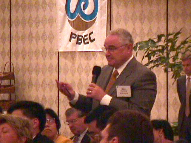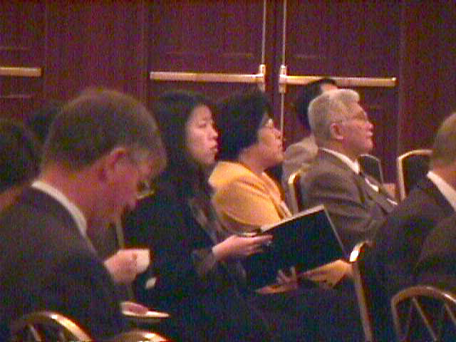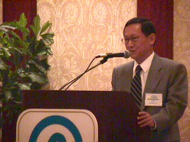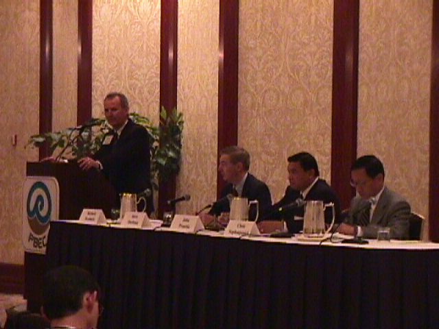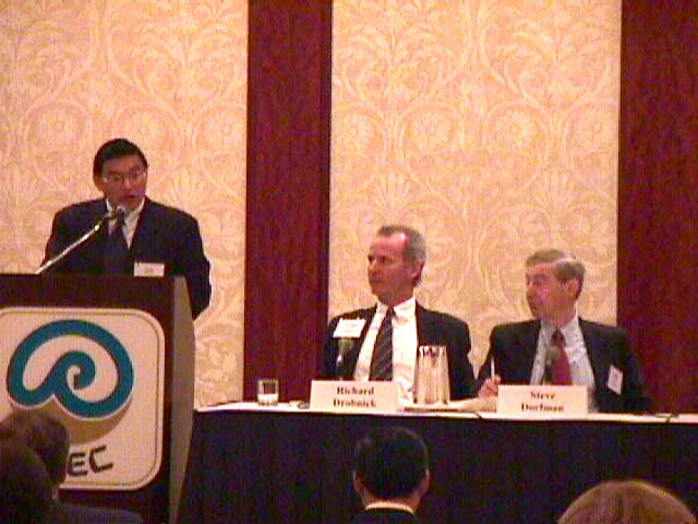 From Left to Right: Session chair Mr. Richard Drobnick, Vice Provost, International Affairs Research Professor, Management and Organizing Director, Center for International Business/IBEAR Executive Programs, University of Southern California; and session panelists Mr. Steven D. Dorfman,Vice Chairman, Hughes Electronics Corporation; Mr. John A. Prasetio, Chairman & Managing Partner, Prasetio Utomo & Co / Arthur Andersen (Jakarta); and Mr. Chote Sophonpanich, Chairman, Green Spot Co., Ltd. (Bangkok).