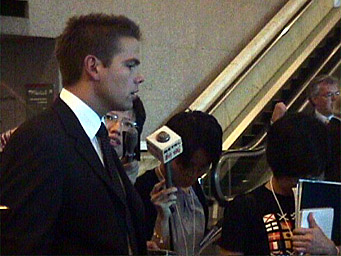 Journalists crowd Murdoch as he leaves the plenary session. |