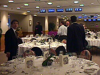 With a race every 30 minutes, delegates busily trade betting tips over a seafood buffet dinner. |