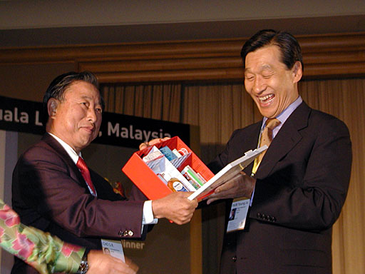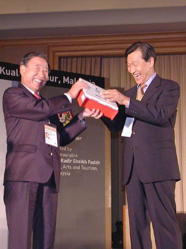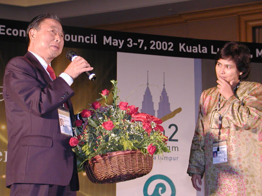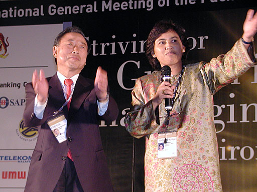 ![[ May 7 ]](07handover4-sm.jpg) | | PBEC Chairman S.R. Cho takes a moment to thank PBEC Malaysia Director General Rohana Tan Sri Mahmood for her work in making the Kuala Lumpur IGM a success. |