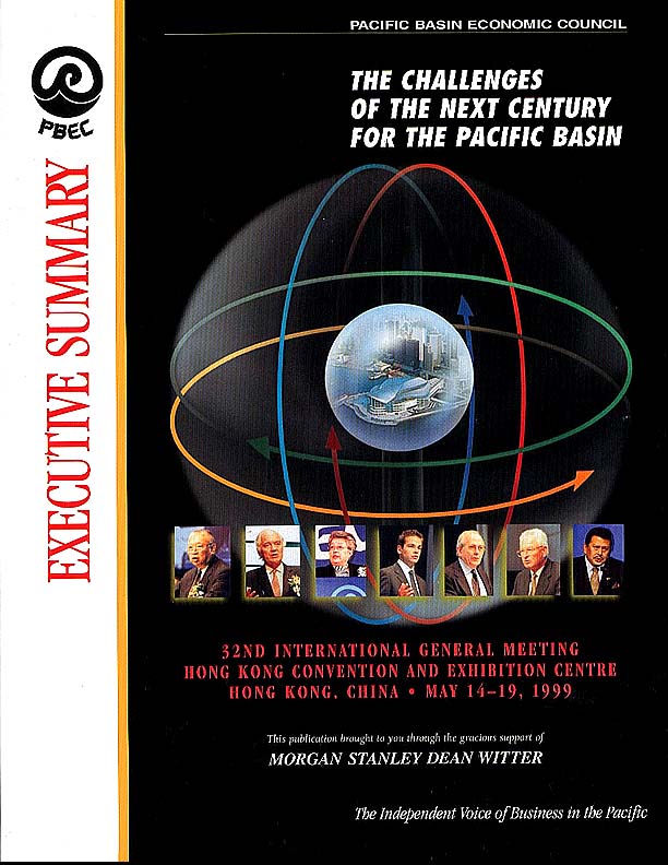 | This Executive Summary includes several speeches, transcripts of sessions and photos from the 31nd International General Meeting, held May 14-19, 1999 in Hong Kong, China. Key speakers include: Tung Chee Hwa, Hong Kong SAR Chief Executive; His Excellency Joseph Ejercito Estrada, President of the Republic of the Philippines; Her Excellency Madam Wu Yi, State Councillor of the People's Republic of China; The Honorable Peter Costello, Treasurer of Australia; Michel Camdessus, Managing Director of the International Monetary Fund; John R.H. Bond, HSBC Group Chairman; Lachlan Murdoch, Chairman & CEO of News Ltd. (Australia); and Professor Jagdish Bhagwati, Columbia University. A full delegate list is also included. | |||